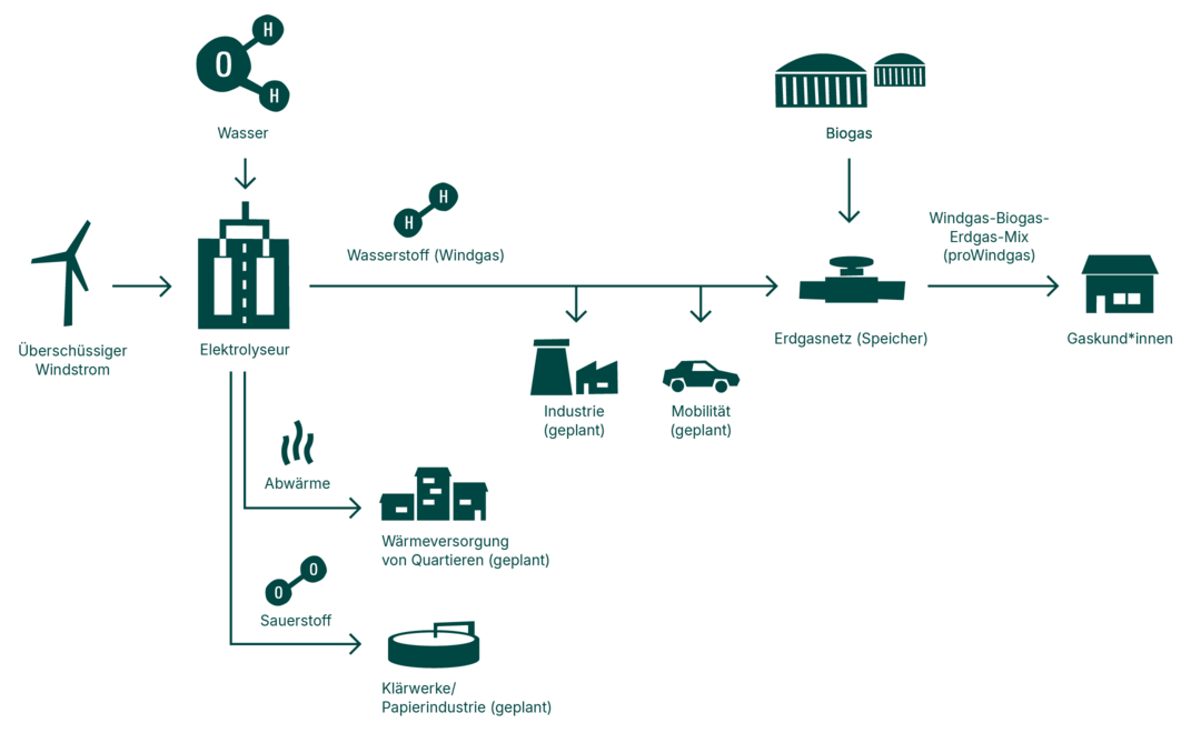 Bei Green Planet Energy setzen wir heute überschüssigen Ökostrom vor allem aus Windkraft ein, um Wasser mithilfe von Elektrolyseuren in seine beiden Elemente aufzuspalten: in Wasserstoff und Sauerstoff. Der Sauerstoff kann in die Atmosphäre abgelassen oder an andere Abnehmer verkauft werden. Der Wasserstoff wird ins Gasnetz geleitet. Dort vermischt er sich mit dem darin bereits enthaltenen Erdgas und Biogas.
