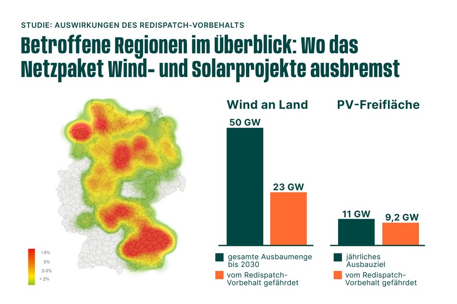 Mit Blick auf das Jahr 2025 identifiziert die Studie 90 Landkreise, die nach den Plänen des Ministeriums als „kapazitätslimitierte Netzgebiete“ gelten würden. Dort dürften neue Wind- und Solaranlagen zwar weiter gebaut werden, die Betreiber erhielten jedoch keine Entschädigung mehr für Abregelungen ihrer Anlagen aufgrund von Netzengpässen (Redispatch). Diese Änderung wäre ein massiver Angriff auf die Wirtschaftlichkeit der Projekte.